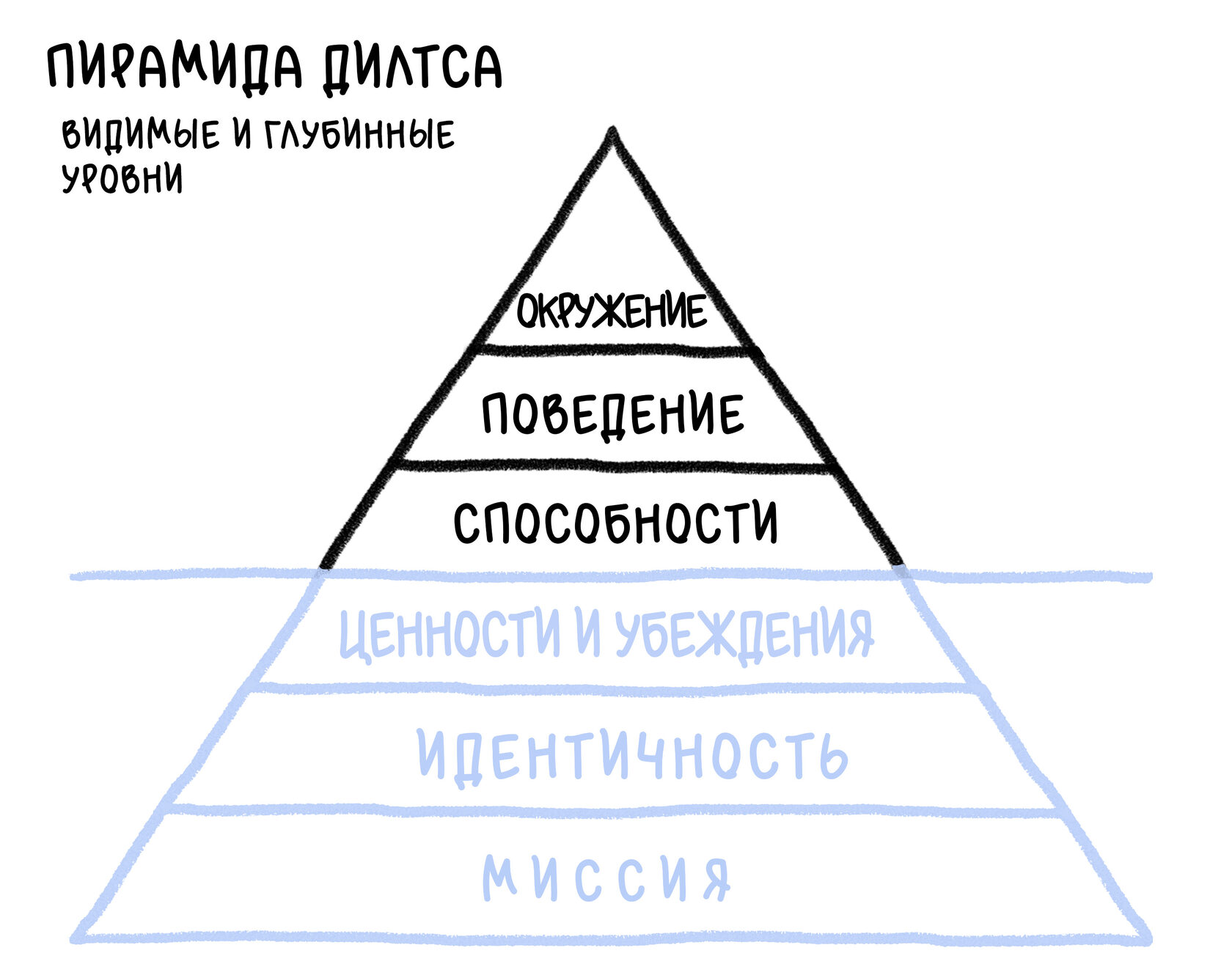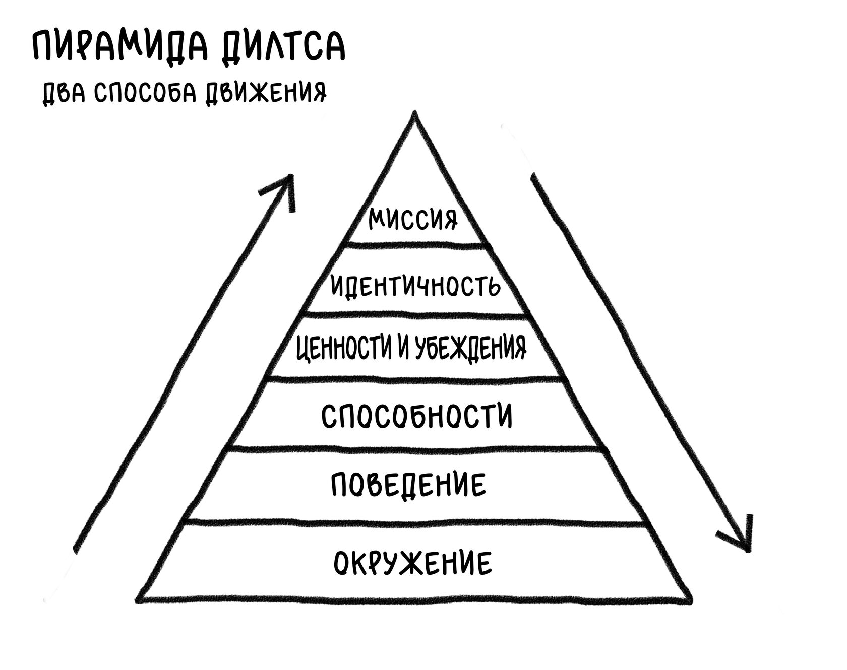 Пирамида Дилтса помогает увидеть, на каком уровне что-то пошло не так, и шаг за шагом вернуть целостность внутреннего и внешнего.