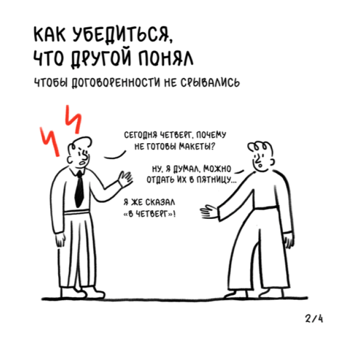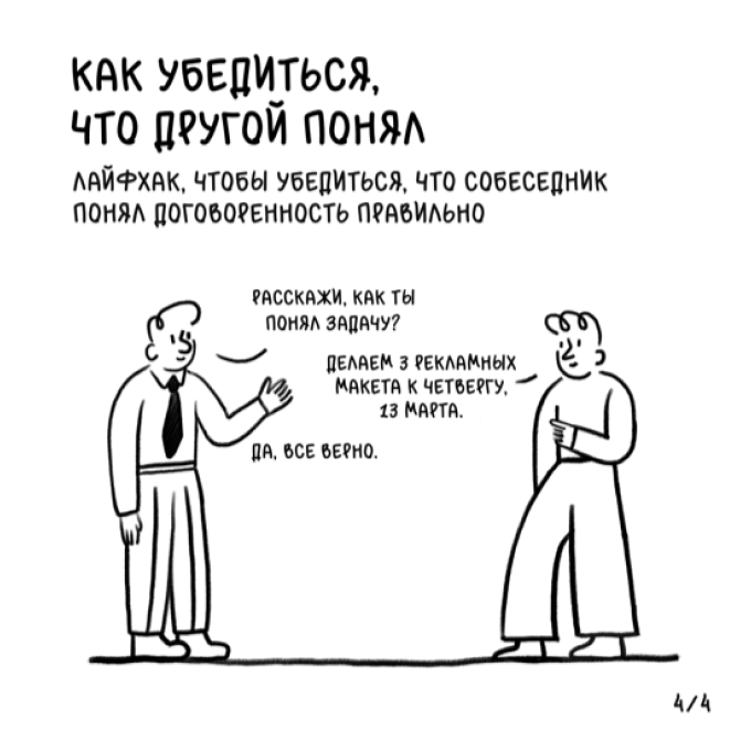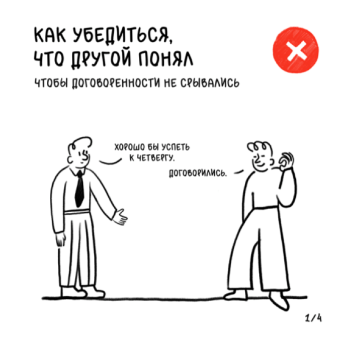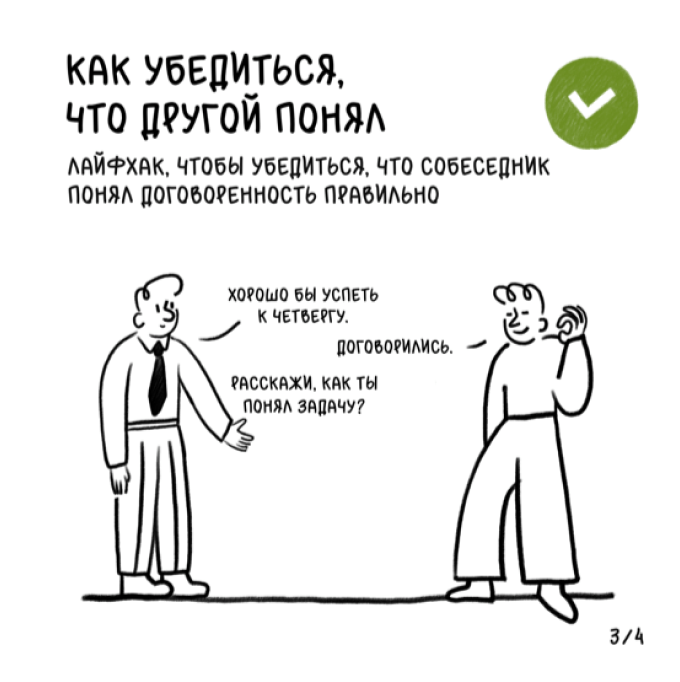 Человек может сам сказать, как он понял собеседника. Собеседник исправит неточности или подтвердит, что все правильно. Это поможет избежать сюрпризов и конфликтов.